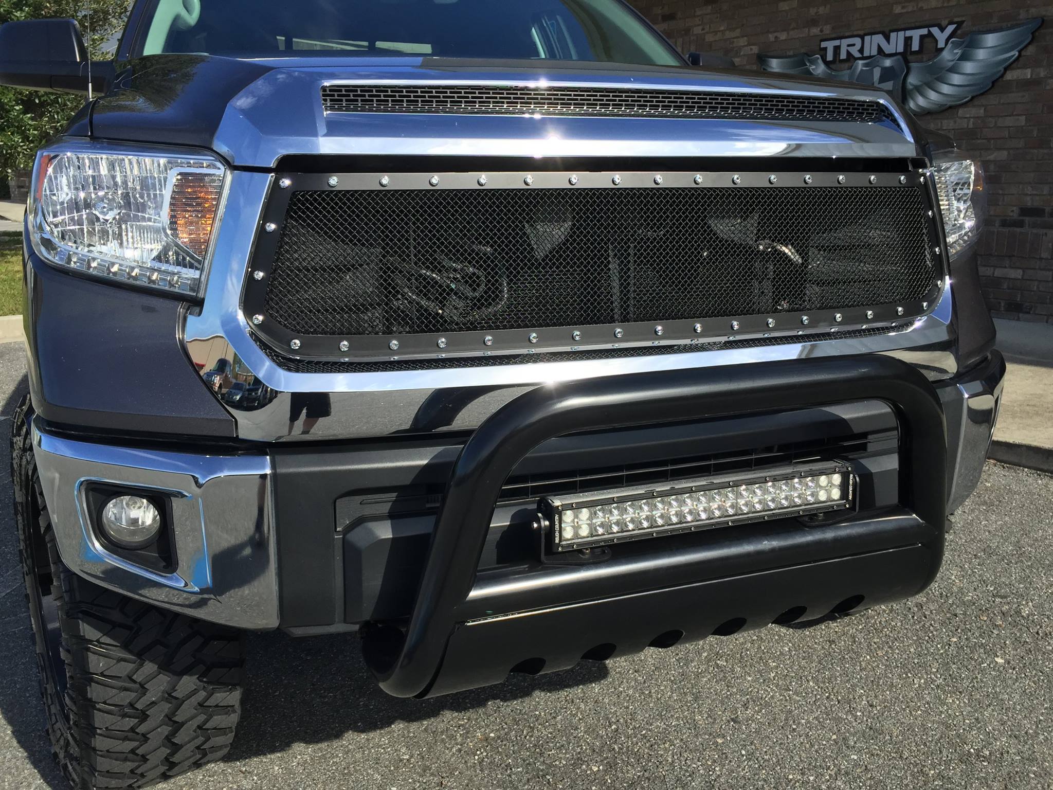 Trinity Motorsports is proud to have built one of the meanest Tundras in Savannah! Special thanks to Mark for trusting our vision for his 2014 Tundra 4WD. Looking like a futuristic off-road machine, the Toyota features a 6-inch Rough Country suspension lift, 20×10-inch Gear Alloy Big Block wheels, Nitto 35-inch Trail Grapplers, Trex X-Metal mesh grille, and 20-inch Rough Country light bar.  ICI Magnum stainless steel bumpers were added for better looks, upgraded safety, and much-needed tire clearance. And to top this Tundra off, we equipped it with a great sounding aFe Power exhaust with black tips.